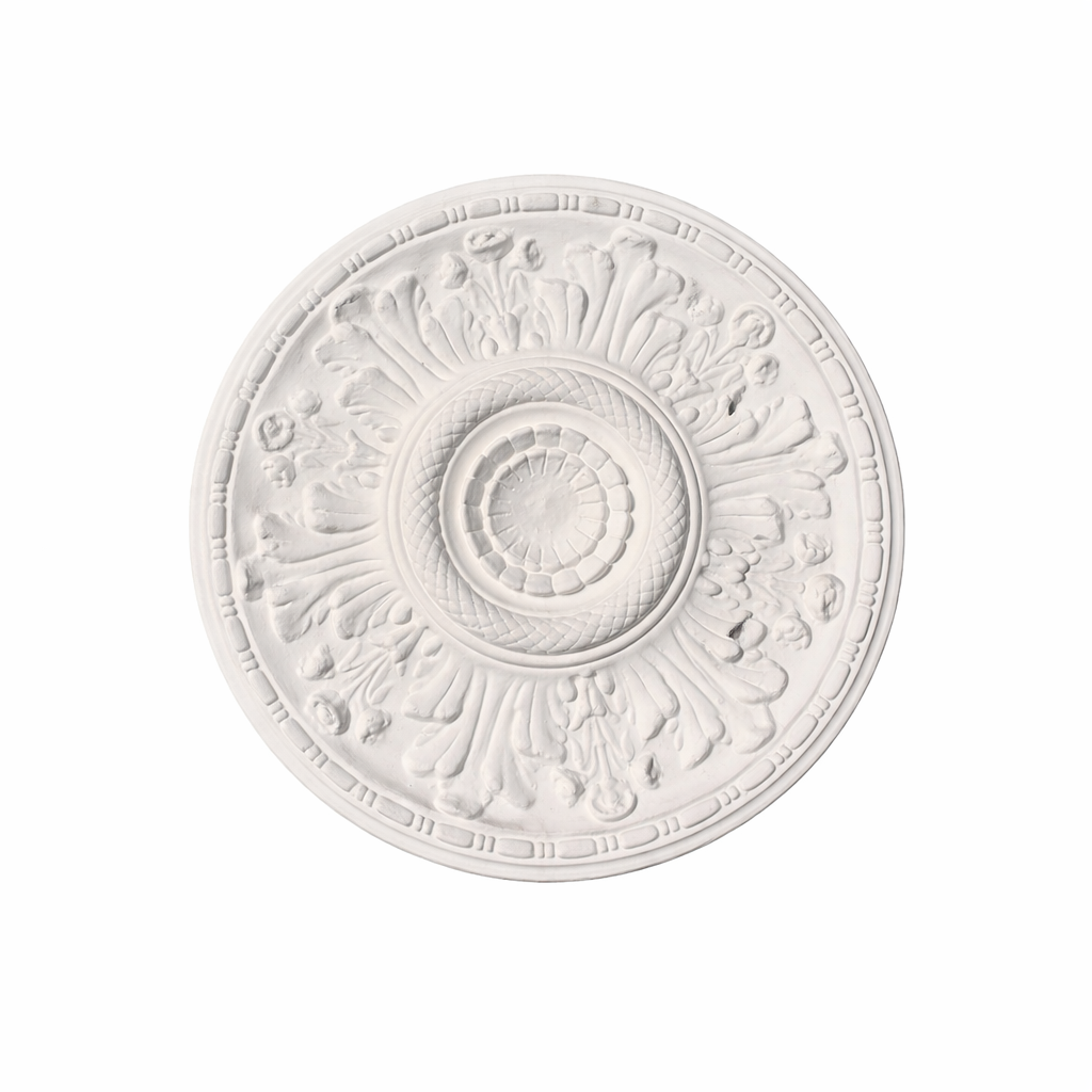 - Los rosetones vienen en yeso bruto que puede presentar polvo o leves manchas desde el proveedor, la imagen lo muestra pintado como debería quedar después de la instalación. Es importante considerar que siempre habrá que pintarlo para nivelar el color con el cielo.